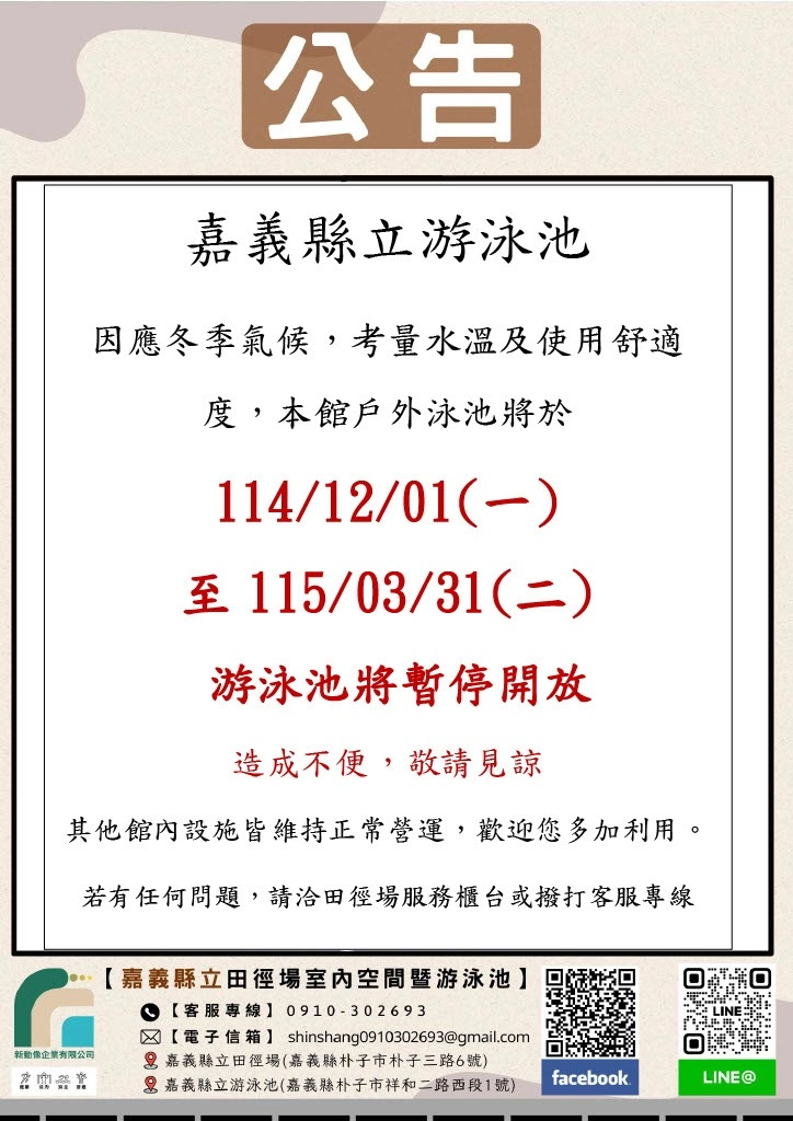 因應冬季氣候,考量水溫及使用舒適度,本館戶外游泳池將於以下期間暫停開放: